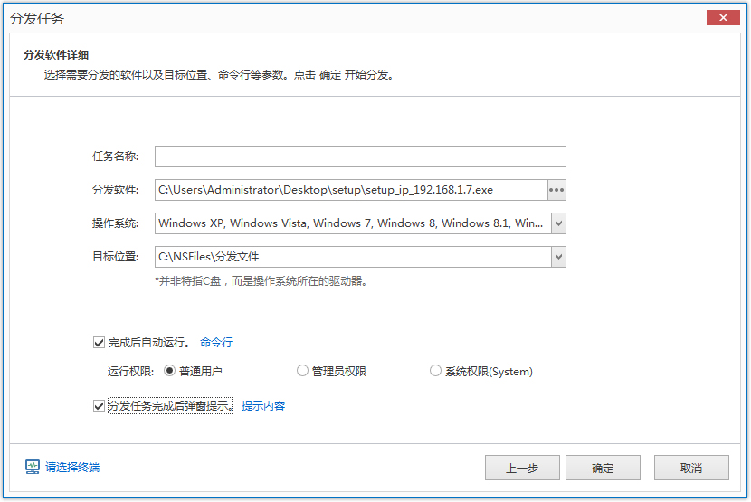 您可以填写任务名称,选择要分发的软件以及选择分发到终端计算机的目标位置等参数。