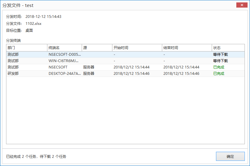 设置完分发参数以及分发用户后, 点击“确定”按钮,开始上传分发任务文件。