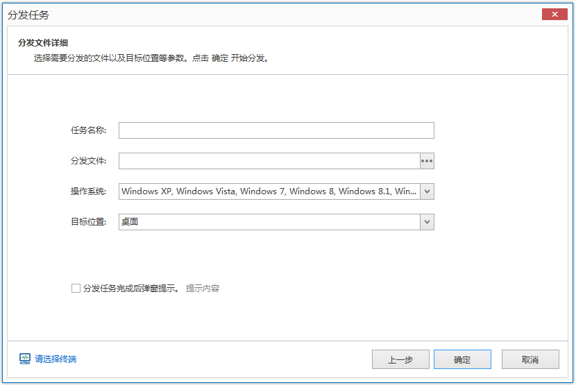 您可以填写任务名称,选择要分发的文件以及选择分发到终端计算机的目标位置,同时也可以选择适用的操作系统 等参 数。如果您希望终端用户收到分发文件后系统会弹窗提示,您可以勾选分发任务完成后弹窗提示,然后编辑提示内容。