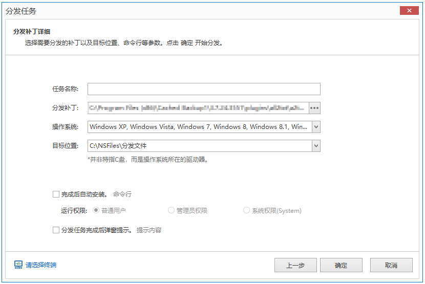 选择“分发补丁”选项,点击“下一步”按钮,开始设置分发补丁参数。具体参数可参考分发软件 。