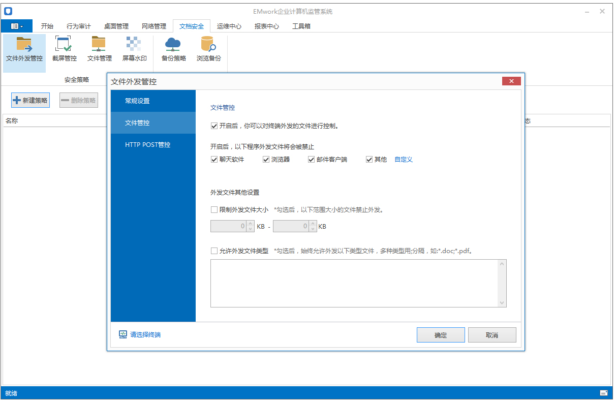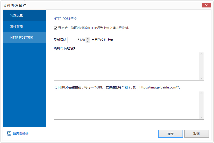 同时EMwork还具有HTTP POST管控功能,开启后,您可以对终端HTTP行为上传文件进行控制,可以限制用户上传文件大小,限制浏览器使用,同时针对常用到的一些站点可以放行设置,灵活方便。