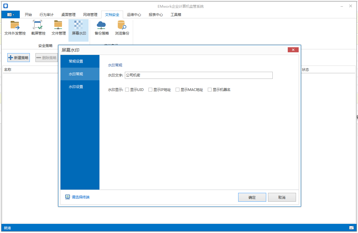 选择文档安全分组,点击屏幕水印功能按钮,新建策略,点击水印常规标签,设置显示水印文字。可选择水印显示的类别。